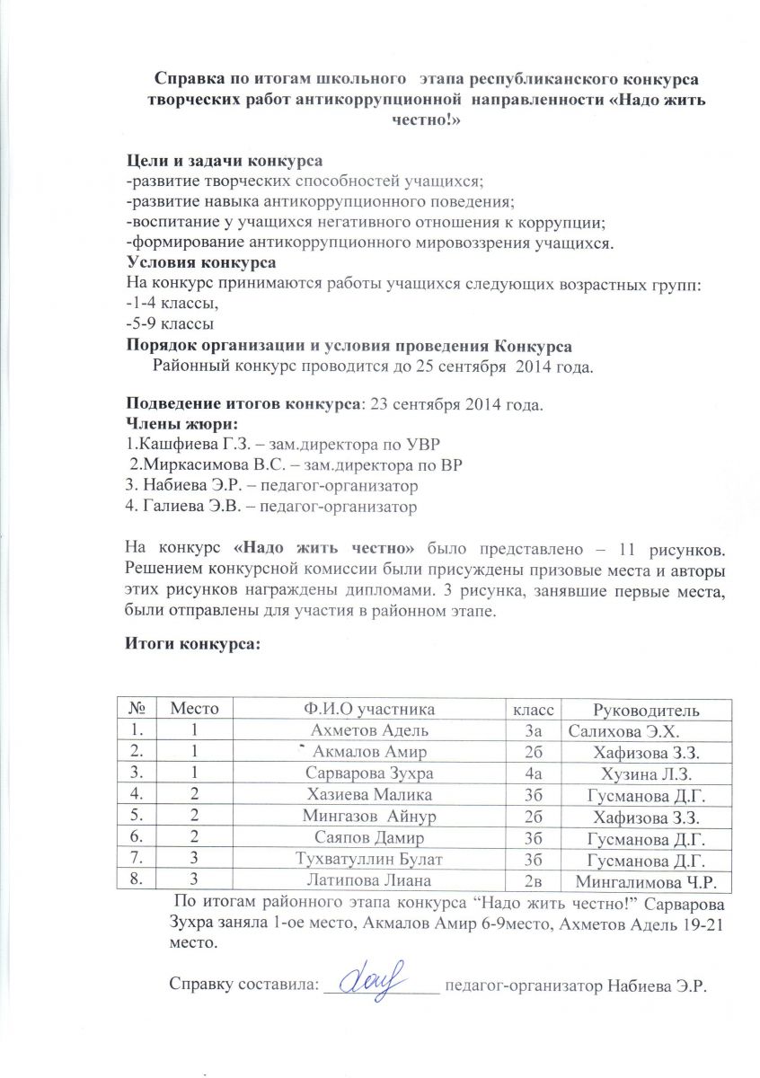 Справка по итогам школьного этапа республиканского конкурса "Надо жить честно"