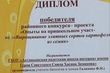 Дипломом победителя районного конкурса - проекта "Опыты на пришкольном участке: "Выращивание элитных сортов картофеля из семян" награждён ГБОУ "Актанышская КШИ" . Руководитель учиель биологии и химии Галивова Ф.Н. Поздравялем!