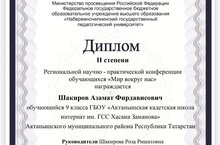 Ученик 9а класса нашей школы Шакиров Азамат награждён Дипломом II степени Региональной научно-практической конференции обучающихся "Мир вокруг нас", руководитель Шакирова Р.Р. награждена Благодарственным письмом, ученик 7 класса Абзаев Руслан получил сертификат участника. Поздравляем!