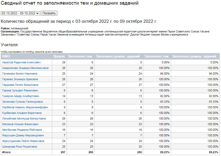 Сводный отчет по заполняемости тем и домашних заданий (03-07.10.2022)