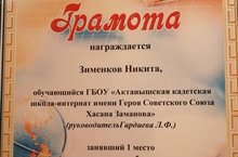 Ученик 8б класса нашей школы Жадов Артём(руководитель Шакиров И.А.) занял II место республиканского конкурса для общеобразовательных организаций РТ, реализующих кадетское образование «Они не ждали посмертной славы, они хотели со славой жить…» в номинации «Конкурс видеороликов «Я помню – я горжусь!», награждён Дипломом II степени.