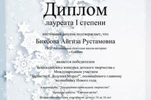 Ученица 7 класса нашей школы Бикбова Айгиза (руководитель Фархутдинова Л.Ф.) награждена Дипломом лапуреата I cтепени Всероссийского конкурса детского творчества с Международным участием "Здравствуй, Дедушка Мороз!", посвященному главному волшебнику Нового года в номинации "Декоративно-прикладное искусство".