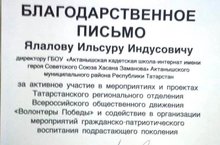 Директор нашей школы Ялалов Илсур Индусович награждён БЛАГОДАРСТВЕННЫМ ПИСЬМОМ за активное участие в мероприятиях и проектах Татарстанского регионального отделения Всероссийского общественного движения "Волонтеры Победы" и содействие в организации мероприятий гражданско-патриотического воспитания подрастающего поколения. Поздравляем!