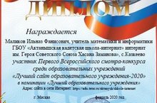 Учитель математики и информатики нашей школы Маликов И.Ф. награждён Дипломом Первого Всероссийского смотра-конкурса среди образовательных учреждений "Лучший сайт образовательного учреждения-2020" в номинации "Лучший сайт образовательного учреждения" и подарочным сертификатом на сумму 100 СМАРТрублей. Поздравляем!