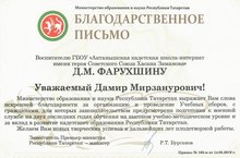 Благодарственным письмом награждён заместитель директора по ВПВ Фарухшина Д.М. за организацию и проведение Учебных сборов, с гражданами, для которых законодательством предусмотрена подготовкак военной службе на высоком учебно-методическом уровне и за вклад в развитие кадетского образования РТ. Поздравляем!