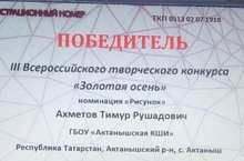 Ученик 6б класса нашей школы Ахметов Т.Р. награждён грамотой победителя III Всероссийского творческого конкурса "Золотая осень", а руководитель воспитатель 6б класса Хайдаров А.А. - благодарственным письмом за подготовку победителя и призёра III Всероссийского творческого конкурса "Золотая осень" и вклад в развитие дистанционных соревнований. Поздравляем и желаем успехов!