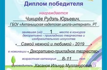 Ученик 5 класса нашей школы Чикирёв Рудэль(руководитель Хасанов И.М.) занял I место в конкурсе декоративно-прикладного творчества и изобразительного искусства " в номинации "Декоративно-прикладное творчество" и награждён Дипломом победителя. Поздравляем!