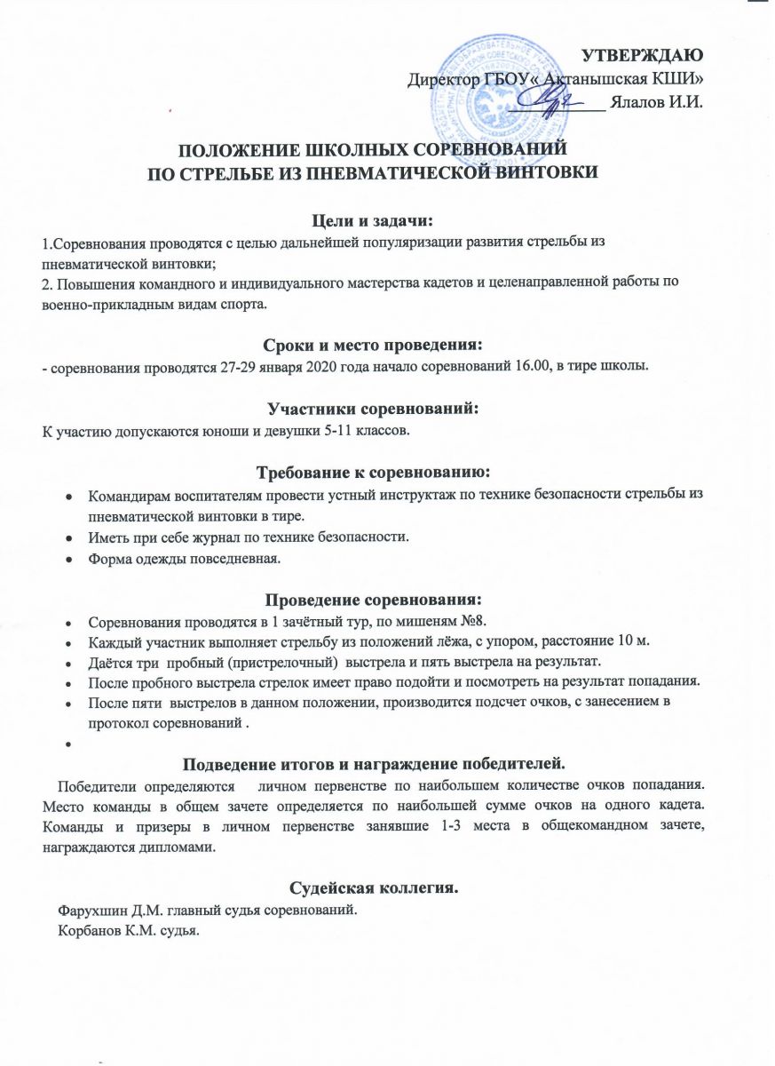 20-23 января в школе проходят школьные соревнования по стрельбе из пневматической винтовки «Меткий юнармеец". Соревнования проводятся с целью дальнейшей популяризации развития стрельбы из пневматической винтовки. К участию допускаются юноши и девушки 5-11 классов.