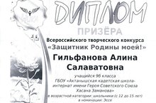 Ученица 9б класса нашей школы Гильфанова А.(руководитель Корбанов К.М.) стала призёром Всероссийского творческого конкурса "Защитник Родины моей!" в номинации "Эссе" и награждена Дипломом. Поздравляем!