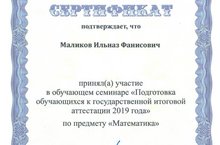 Следующие наши учителя приняли участие в обучающем семинаре "Подготовка обучающихся к ГИА 2019 года" и получили сертификаты: по предмету "математика" - Маликов И.Ф., "физика"- Мисбахова Р.Р., "русский язык" - Муллахметова Е.Р., "история и обществознание" - Авзалов Р.А., "биология" - Низамов А.Р.