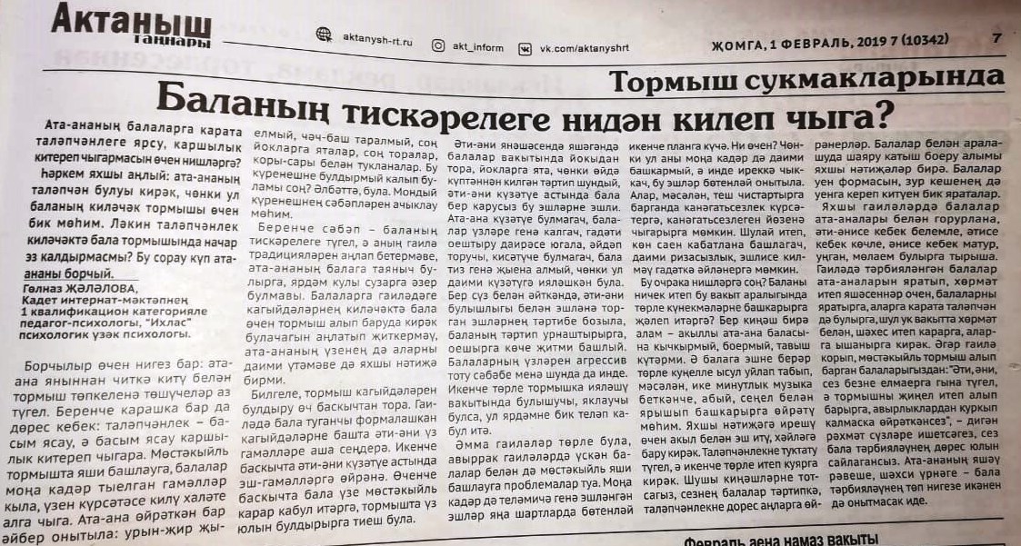 Опубликована статья "Баланың тискәрелеге нидән килеп чыга?" педагога-психолога нашей школы Залаловой Г.Г. в районной газете "Актаныш таңнары" , №2(01.02.2019)