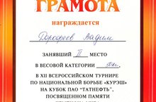 Ученик 9А класса нашей школы Дорофеев В. занял II место в XII всероссийском турнире по национальной борьбе "Курэш" на кубок ПАО "ТАТНЕФТЬ", посвященном памяти чемпиона мира Б.З.Валиева, награждён грамотой и медалем. Поздравляем и желаем дальнейших успехов!