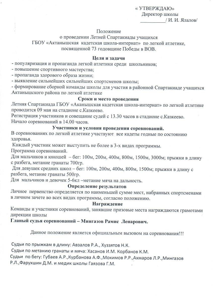 9 мая в нашей школе проводится летняя Спартакиада учащихся ГБОУ "Актанышская КШИ" по легкой атлетике, посвященная 73 годовщине Победы в ВОВ. Регистрация участников и совещание судей с 13.30 часов на стадионе с.Казкеево. Начало соревнований в 14.00 часов.