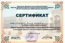 17 декабря в ФГБОУ ВО "НГПУ" г. Наб.Челны состоялся республиканский методический семинар "Проектирование современного урока физической культуры в основной школе в соответствии с требованиями ФГОС", в котором приняли участие учителя физкультуры Мингазов Р.Л. и Гумеров А.А. и получили сертификаты.
