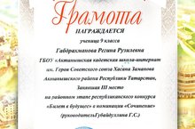 Ученица 9А класса нашей школы Габрахманова Регина (руководитель Губайдуллина Г.С.) заняла III место на районном этапе республиканского конкурса "Билет в будущее" и награждена грамотой. Поздравляем и желаем дальнейших успехов!