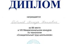 Ученик 7А класса Габитов Тимур(руководитель Корбанов К.М.) занял III место в VIII Межрегиональном конкурсе по технологии "Созидательный труд школьников" и награжден Дипломом.