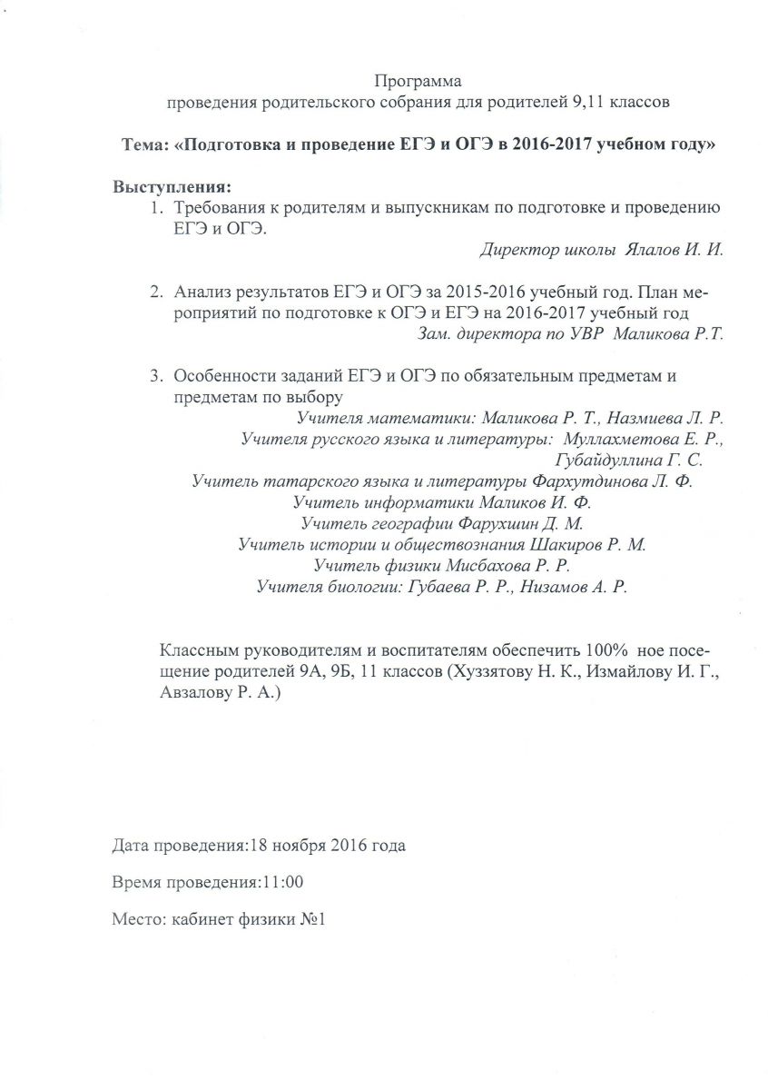 Программа проведения родительского собрания для родителей 9,11 классов