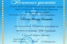 Ученики 7а нашей школы: Габитов Тимур и Валиев Булат награждены почетными грамотами, денежными поощрениями(Тимур 7 тыс. руб., Булат 15 тыс.руб.) за активную помощь ТНВ "Урожай" в период летних каникул.