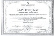 19 мая учитель географии Шакирова Р.Р. участвовала в вебинаре "Комплексное использование ресурсов современного учебно-методического комплекта как условие достижения результатов обучения и создания положительной мотивации в изучении предмета географии" и получила сертификат участника.