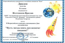 Ученик 5 класса нашей школы Желтоносов Ярослав(воспитатель Курбанова А.Ф.) стал призером II Всероссийского конкурса, посвященного Дню космонавтики "Пусть звезды опять нам назначат свидание!" и награжден Дипломом II степени.