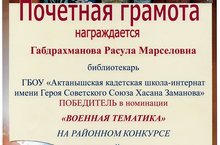 Библиотекарь нашей школы Габдрахманова Расула Марселовна стала победителем районного конкурса буктрейлеров "Расскажу о книге" в номинации "Военная тематика" и награждена почетной грамотой. Поздравляем и желаем дальнейших побед!
