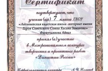 Ученица 7 класса нашей школы Фархутдинова Айназ(руководитель Фархутдинова Л.Ф.) приняла участие в Международном конкурсе творческих и проектных работ "Династии России" и награждена сертификатом участника, подписанным первым заместителем министра образования и науки РТ А.И.Поминовым. Поздравляем!