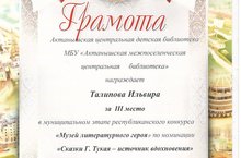 Ученик 5 класса нашей школы Талипов Ильвир(руководитель Фархутдинова Л.Ф.) занял 3 место в муниципальном этапе республиканского конкурса "Музей литературного героя" по номинации "Сказки Г.Тукая - источник вдохновения" и награжден книгой. Учащиеся 5-6 классов: Фардиева З., Габитов Т., Ахметханов И., Вильданова Г., Фазлиева А., Гиздатуллина Т., Хисамова Р., Хазиева Д. и Габдрахманова Р. награждены благодарственными письмами за активное участие. Поздравляем!