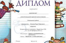 Ученик 7 класса нашей школы Шаехов Азат(воспитатель Мокимов Р.Р.) стал победителем Всероссийского конкурса "Зирәк бала-VIII" и награждён Дипломом I степени. Воспитатель Мокимов Р.Р. награждён сертификатом за подготовку победителя. Поздравляем!