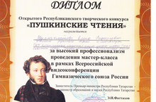 В рамках I Всероссийского (VII Республиканский) открытого творческого конкурса «Пушкинские чтения» проводились мастер-классы учителями, руководителями конкурсных работ учащихся. Учитель русского языка и литературы Муллахметова Елена Рафаэловна награждена дипломом «За высокий профессионализм проведения мастер-класса» в рамках Всероссийской видеоконференции Гимназического союза России. Поздравляем и желаем дальнейших успехов.
