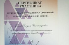 Ученик 11 класса нашей школы Баев Вадим (руководитель Латыйпова М.М.) принял участие в Республиканском конкурсе сочинений, приуроченном ко Дню юриста и получил сертификат участника.