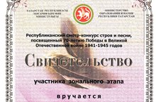Учащиеся нашей школы Фархетдинова А.(6 кл.), Бикташев И.(10 кл.) и Фазлыева Л.(8а кл.) (руководитель учитель татарского языка Фархетдинова Л.Ф.) получили сертификаты за активное участие I Республиканском конкуре "Песня Победы".