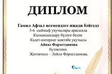 Учащиеся нашей школы Фархетдинова А.(6 кл.), Бикташев И.(10 кл.) и Фазлыева Л.(8а кл.) (руководитель учитель татарского языка Фархетдинова Л.Ф.) получили сертификаты за активное участие I Республиканском конкуре "Песня Победы".