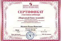 21 января в 18:00 ч. на сайте Webinar.ru состоялся on-line вебинар по теме "Народный банк заданий". Цель вебинара: познакомить с сервисами электронных учебников, которые помогут учителям готовиться к урокам и подбирать задания для проверки знаний обучающихся; рассказать о совместном решении ОАО «Просвещение» с компанией Яндекс, которое позволяет учителям быстро создавать контрольные задания и домашнее задание для учеников, просматривать их результаты (Яндекс.Учёба). Из нашей школы приняли участие и награждены сертификатами участия следующие учителя: учитель русского языка и литературы Хамматуллина Э.А., учитель татарского языка и литературы Фархутдинова Л.Ф., учитель математики и информатики Маликов И.Ф. и учитель математики и физики Мисбахова Р.Р.