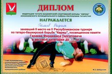 Дипломом награждается ученик 8А класса нашей школы Галиев Рафиль, занявший II место в II Республиканском турнире по татаро-башкирской борьбе "Көрәш", посвященном памяти Гараева Ф.Т. в весовой категории до 45 кг. Поздравляем!