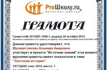 Учительница истории и обществознании Мухаметзянова А.А.награждена грамотой Всероссийского проекта "Источник знаний" в номинации "Знатоки истории". Поздравляем и желаем дальнейших побед!
