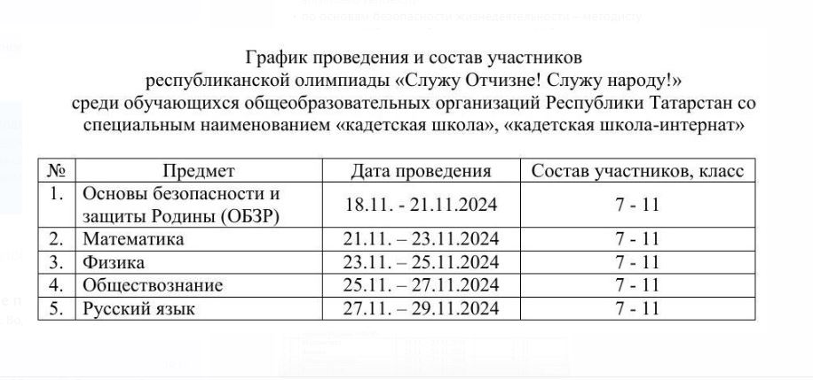 C 19 по 29 ноября в г.Казани проводится республиканская олимпиада "Служу Отчизне! Служу Народу!" среди обучающихся кадетских школ и кадетских школ-интернатов РТ по математике, русскому языку, обществознанию, физике и ОБЗР. Желаем нашим олимпиадникам побед!