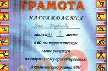 Грамотой призера награждается ученица 5-го класса Нуриева Диана, занявшая III место в 60-ом туристическом слете учащихся по спортивному ориентированию Актанышского района РТ. Молодец! Поздравляем и желаем дальнейших успехов!
