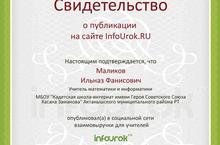 Опубликована методическая разработка учителя математики и информатики Маликова И.Фж. в социальной сети взаимовыручки для учителей "InfoUrok.ru". Web-адрес публикации: infoUrok.ru/material.html?mid=98845. Поздравляем и желаем дальнейших успехов!