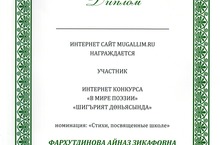 Ученица 5 класса Фархутдинова Айназ награждена Дипломом победителя в номинации "Стихи, посвященные школе" в рамках республиканского конкурса "В мире поэзии". Поздравляем!