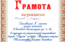 26 апреля в с.Верхнеяркеево прошел турнир по нац.борьбе "Курэш" на приз Мастера спорта Шаяхметова Р.Г. Из Кадетской школы-интернат в весовой категории до 45 кг. ученик 7 класса Галиев Рафиль занял I место , а ученик 6 класса Мухамаев Алмаз - III место. Победители и призеры награждены грамотами. Молодцы! Поздравляем и желаем дальнейших побед! Грамоты...