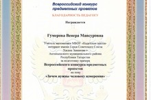 Учительница математики Гумерова В.М. награждена благодарным письмом за подготовку победителей Всероссийского конкурса предметных проектов