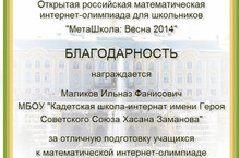 Учитель математики Маликов Ильназ Фанисович награждён Благодарностью за отличную подготовку учащихся к математической интернет-олимпиаде к Открытой российской математической интернет-олимпиады для школьников "МетаШкола: Весна 2014". Поздравляем и желаем дальнейших успехов!