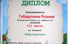 Поздравляем Гибадуллину Розалию, занявшую III место на районнном конкурсе "Мир игрушек"(Руководитель Курбанова А.Ф.).