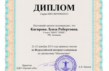 Ученица 9А класса Кагирова Луиза награждена дипломом Всероссийской интернет-олимпиады по дисциплине "Математика"(Учитель математики Гумерова В.М.).