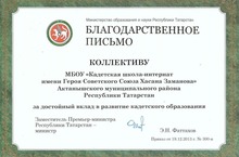 Благодарственным письмом награждается коллектив МБОУ "Кадетская школа-интернат имени Героя Советского Союза Хасана Заманова" Актанышского муниципального района РТ за достойный вклад в развитие кадетского образования. Молодцы! Поздравляем и желаем дальнейших успехов!