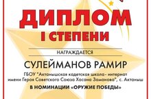 Ученик 5 класса нашей школы Сулейманов Р. награждён Дипломом победителя I степени регионального конкурса "Я рисую Победу!" в номинации "Оружие Победы", ученица 6 класса Валитова А. получилпа сертификат участника, учитель биологии и химии Галимова Ф.Н. - Диплом наставника. Поздравляем!