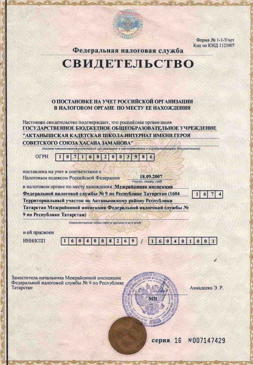 Свидетельство о постановке на учет Российской организации в налоговом органе по месту ее нахождения
