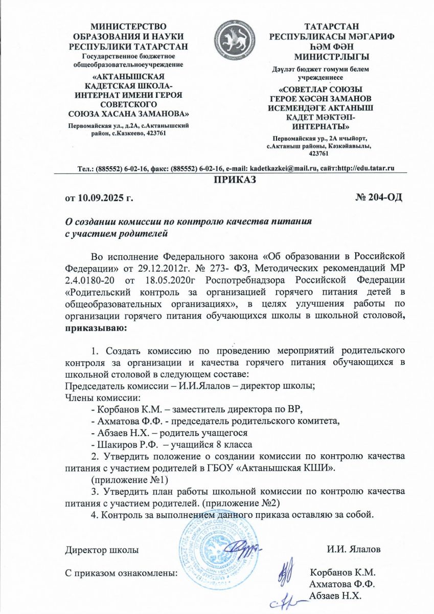 Приказ №204-ОД от 10.09.2025 г. о создании комиссии по контролю качества питания с участием родителей