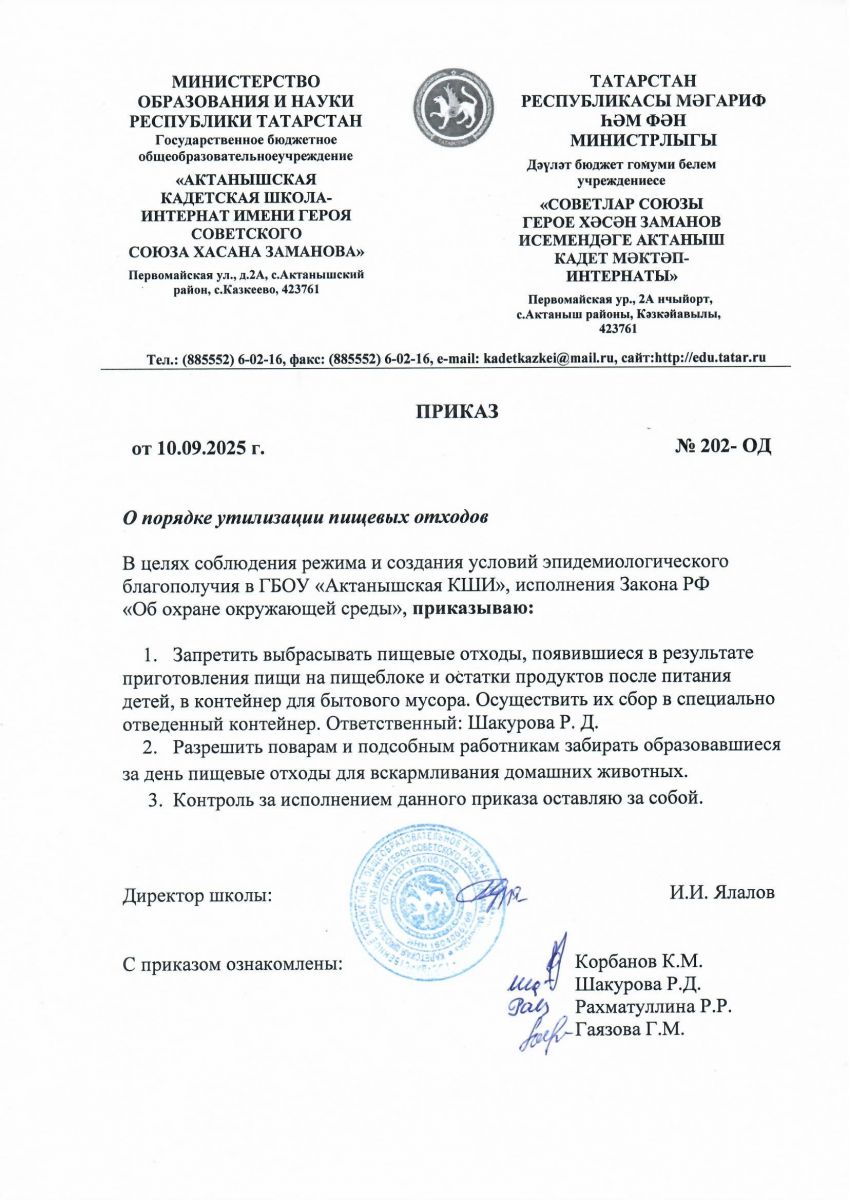Приказ № 204-ОД от 01.09.2025  О порядке утилизации пищевых отходов