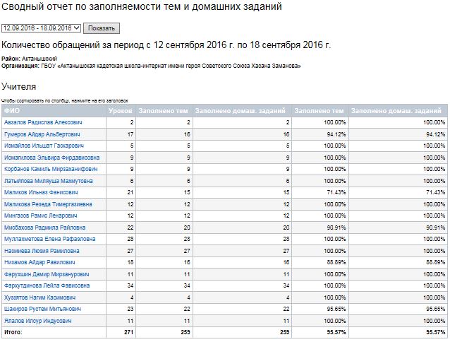 Сводный отчет по заполняемости тем и домашних заданий (12.09.2016-17.09.2016)